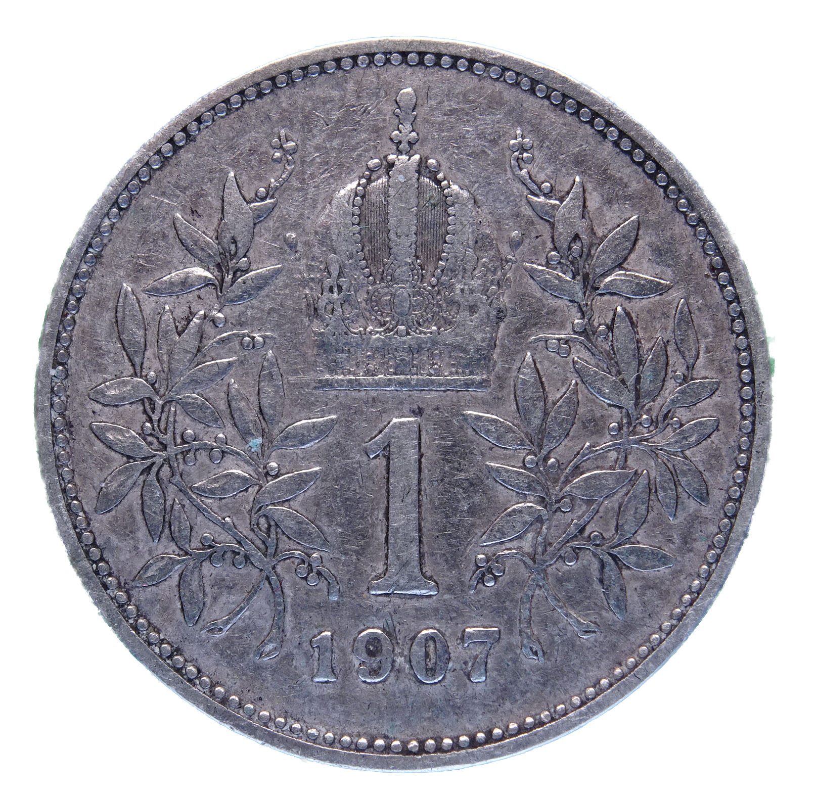 Die 1-Krone-Silbermünze von 1907 gehört zur Kronenwährung des Kaiserreichs Österreich-Ungarn.