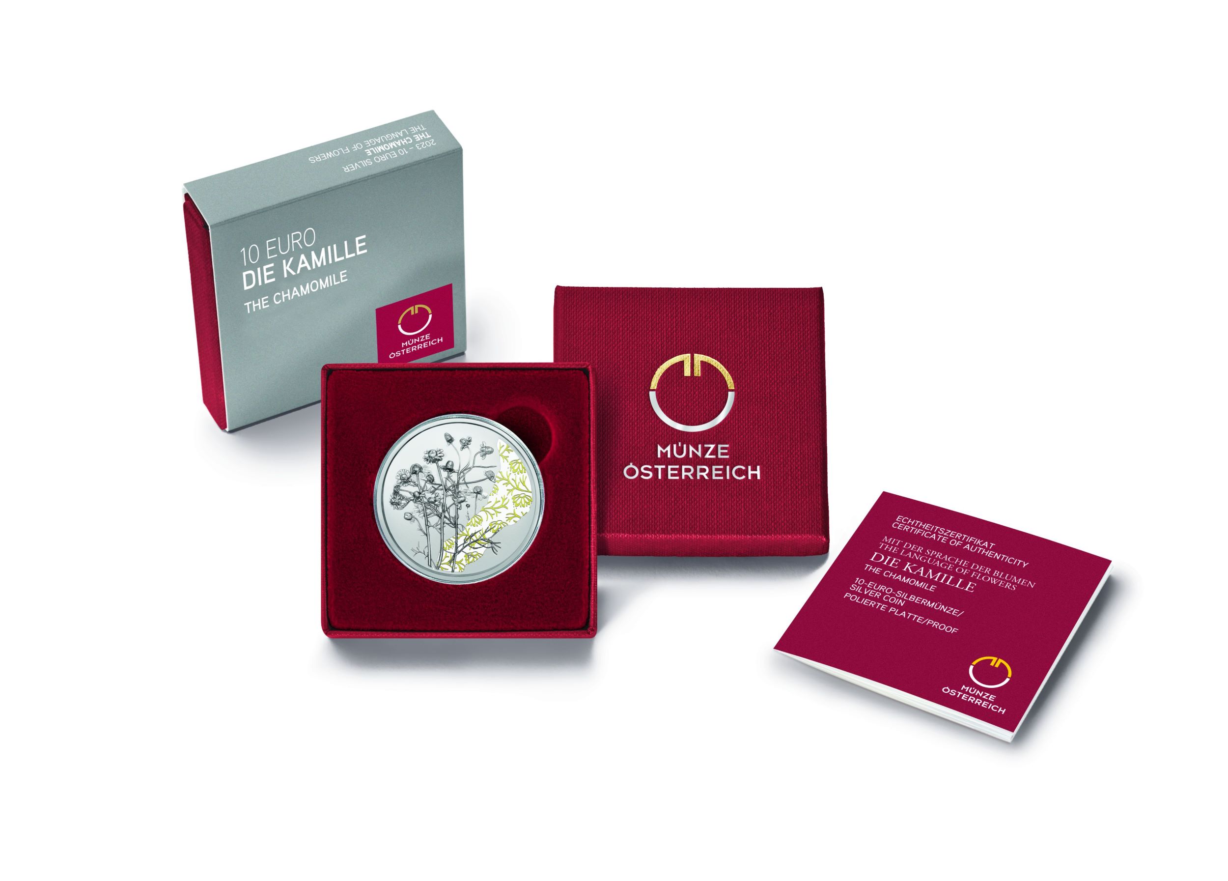 Die andere Seite zeigt Kamillen in voller Blüte, Abdrücke echter Blumen. Dahinter ist ein Band mit stilisierten Kamillen abgebildet. Auf den Münzen der Prägequalität Polierte Platte/Proof ist dieses Ornament farbig bedruckt.