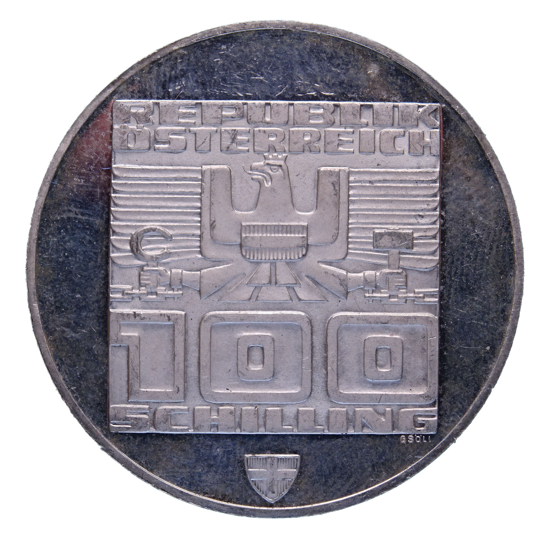 Die 100 Schilling Silbermünze von 1974 ist die 4. Ausgabe der Olympia-Serie zur XII. Olympiade der Winterspiele in Innsbruck. Geprägt in Wien, zeigt sie ein stilisiertes Wintersportmotiv und symbolisiert Österreichs Rolle als Gastgeberland.