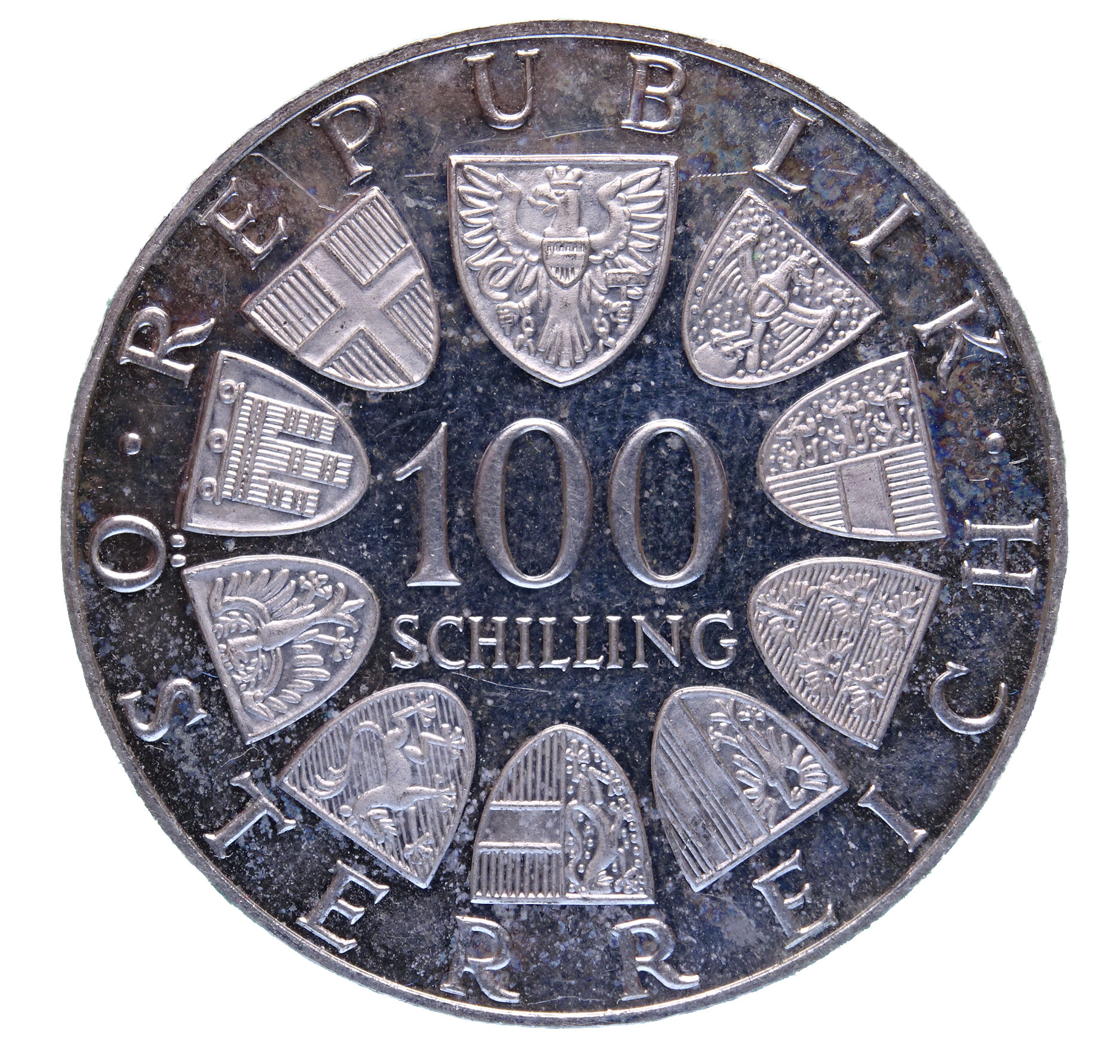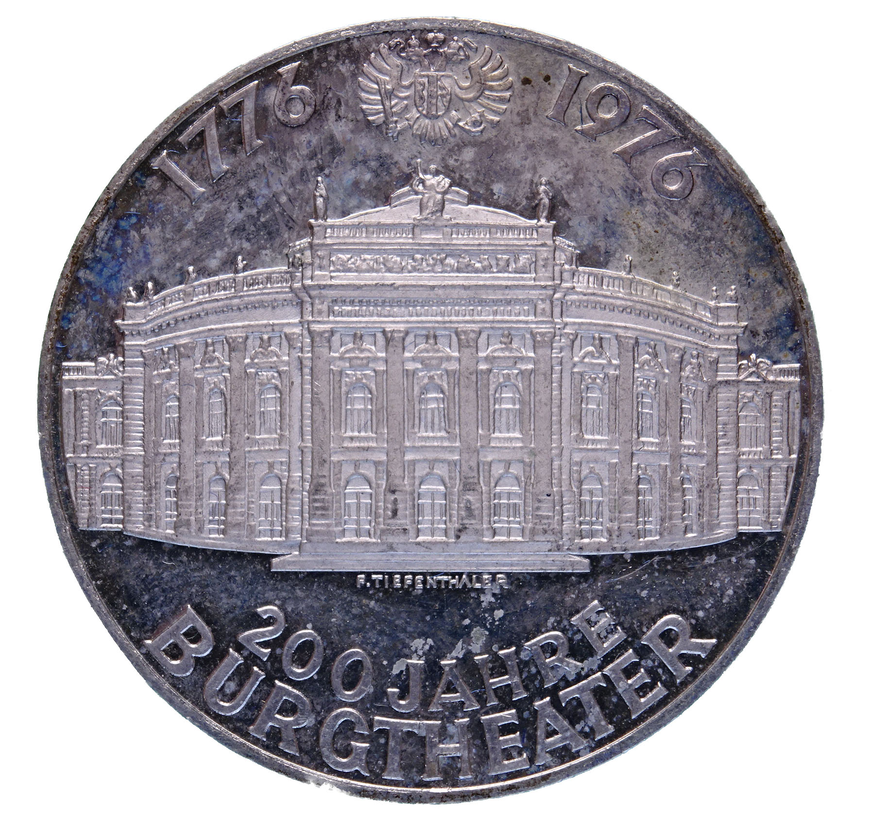 Die 100 Schilling Silbermünze von 1976 wurde anlässlich des 200-jährigen Bestehens des Wiener Burgtheaters ausgegeben. Das Burgtheater gilt als eine der bedeutendsten deutschsprachigen Bühnen und als kulturelles Herzstück Wiens. Die Münze zeigt auf der Rückseite eine detailreiche Darstellung des Theaters mit dem Doppeladler und den Jahreszahlen 1776–1976.