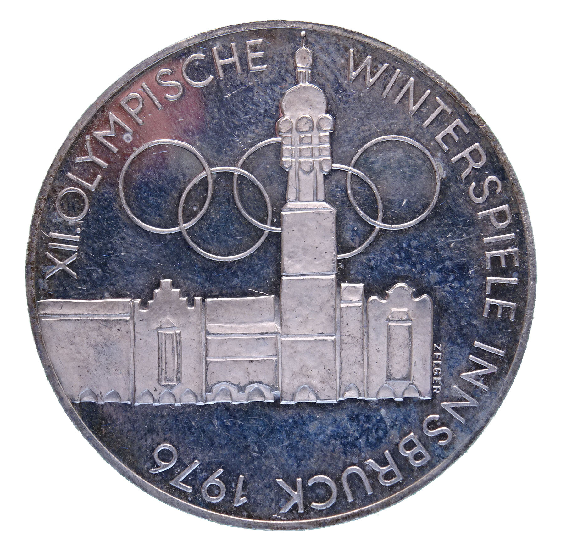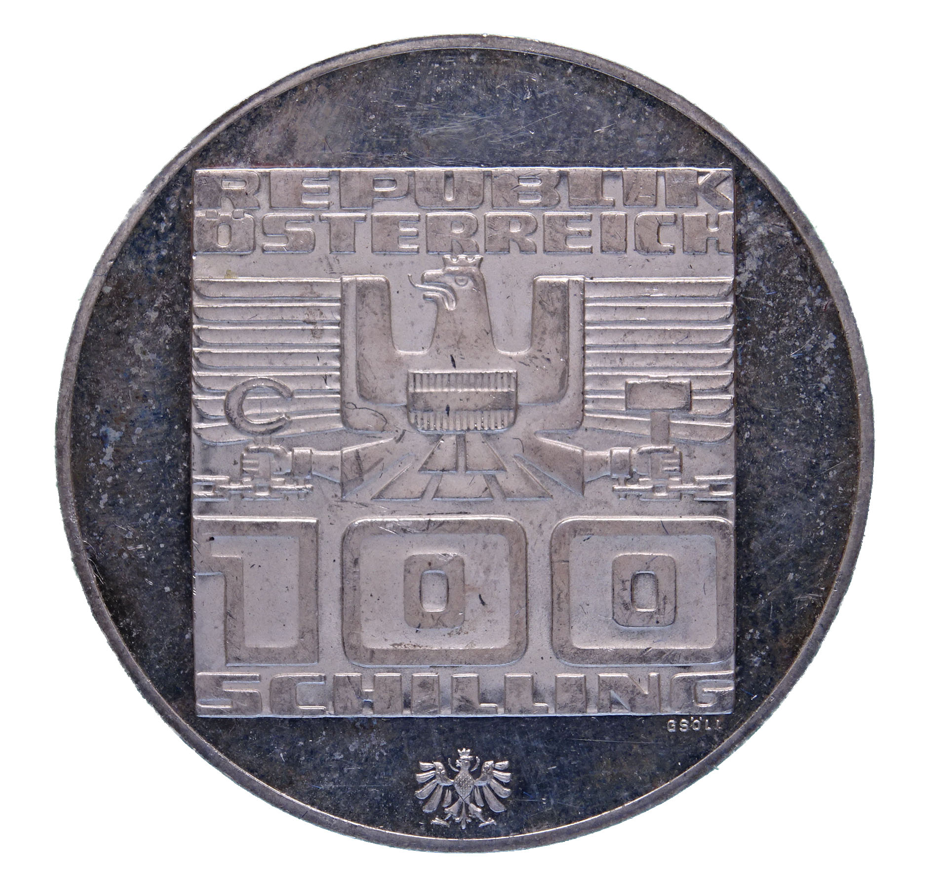 Die 100 Schilling Silbermünze von 1976 ist die 2. Ausgabe der Olympia-Serie zur XII. Olympiade der Winterspiele in Innsbruck. Geprägt in Hall in Tirol, zeigt sie ein stilisiertes Wintersportmotiv mit den Olympischen Ringen und symbolisiert Österreichs Rolle als Gastgeberland.