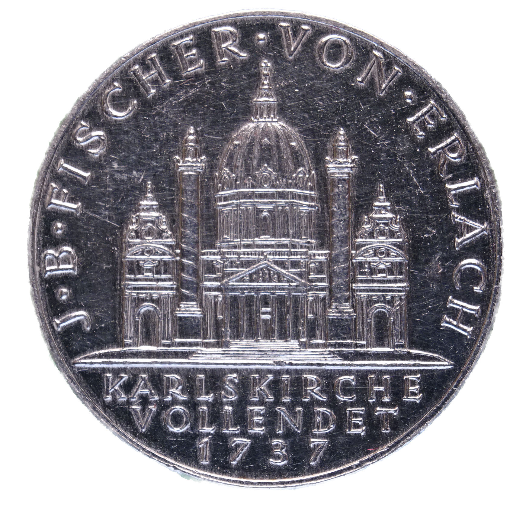 Diese Gedenkmünze würdigt Fischer von Erlach, den bedeutendsten Barockarchitekten Österreichs. Als Schöpfer der Wiener Karlskirche und Mitgestalter der Hofburg prägte er das Stadtbild Wiens nachhaltig. Die Münze wurde 1937 in Silber geprägt und bildet den Abschluss der 2-Schilling-Gedenkserie der Ersten Republik.