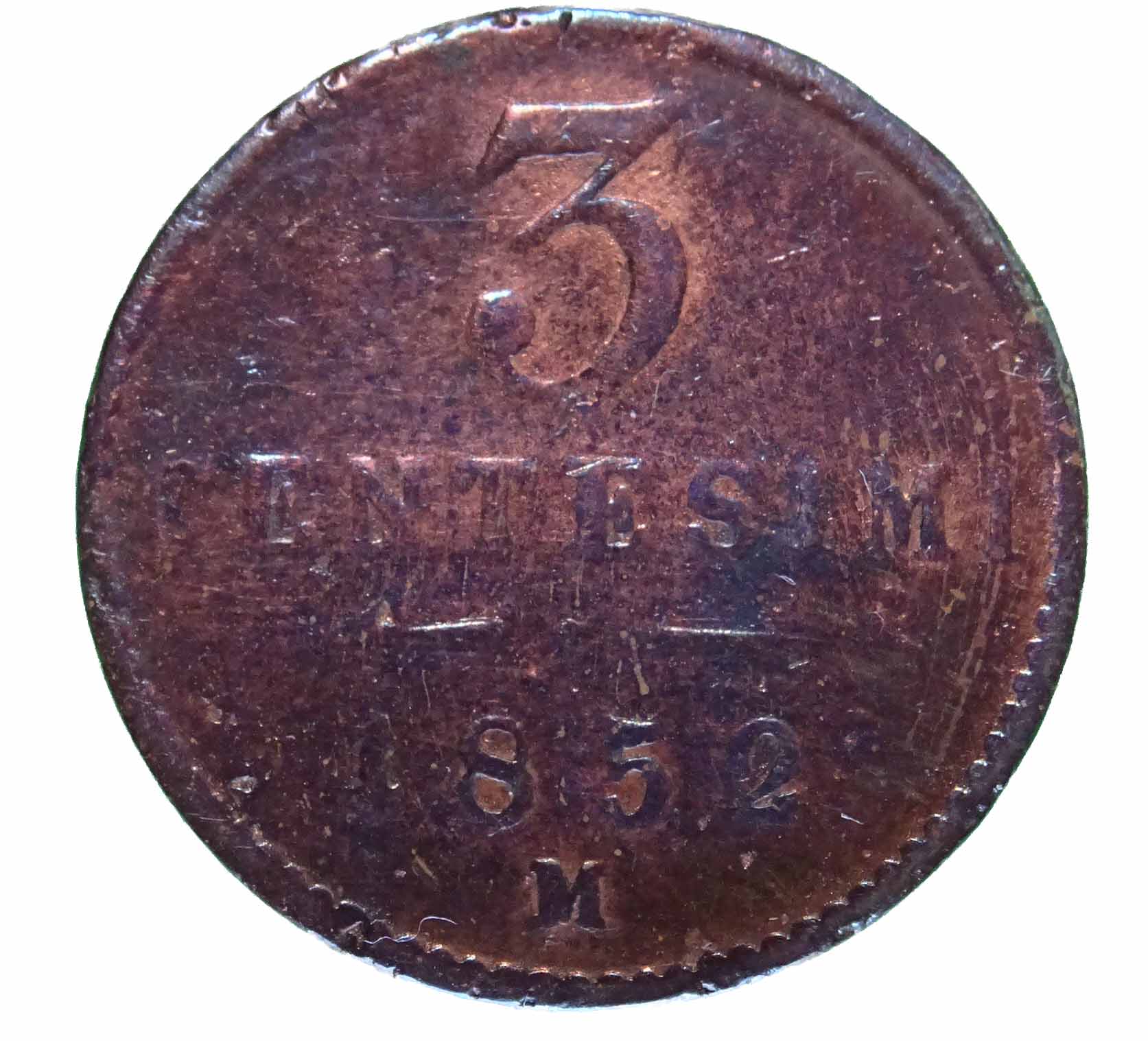 3 Centesimi 1852M – eine seltene Kupfermünze aus dem Königreich Lombardei-Venetien, geprägt in Mailand unter Kaiser Franz Joseph I.. Diese Ausgabe gehört zur ersten Münzserie nach seiner Thronbesteigung und ist ein begehrtes Sammlerstück für Liebhaber der österreichischen Numismatik.