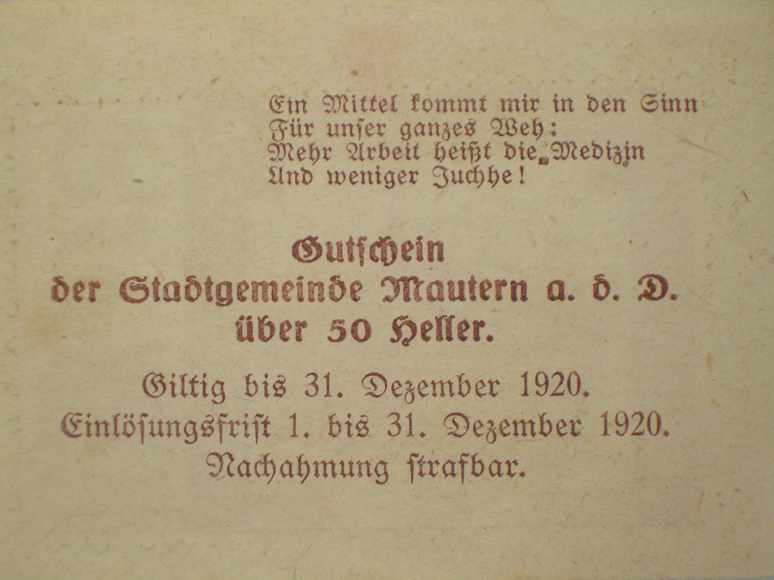 4 Stück 50 Heller Gutschein Stadtgemeinde Mautern an der Donau