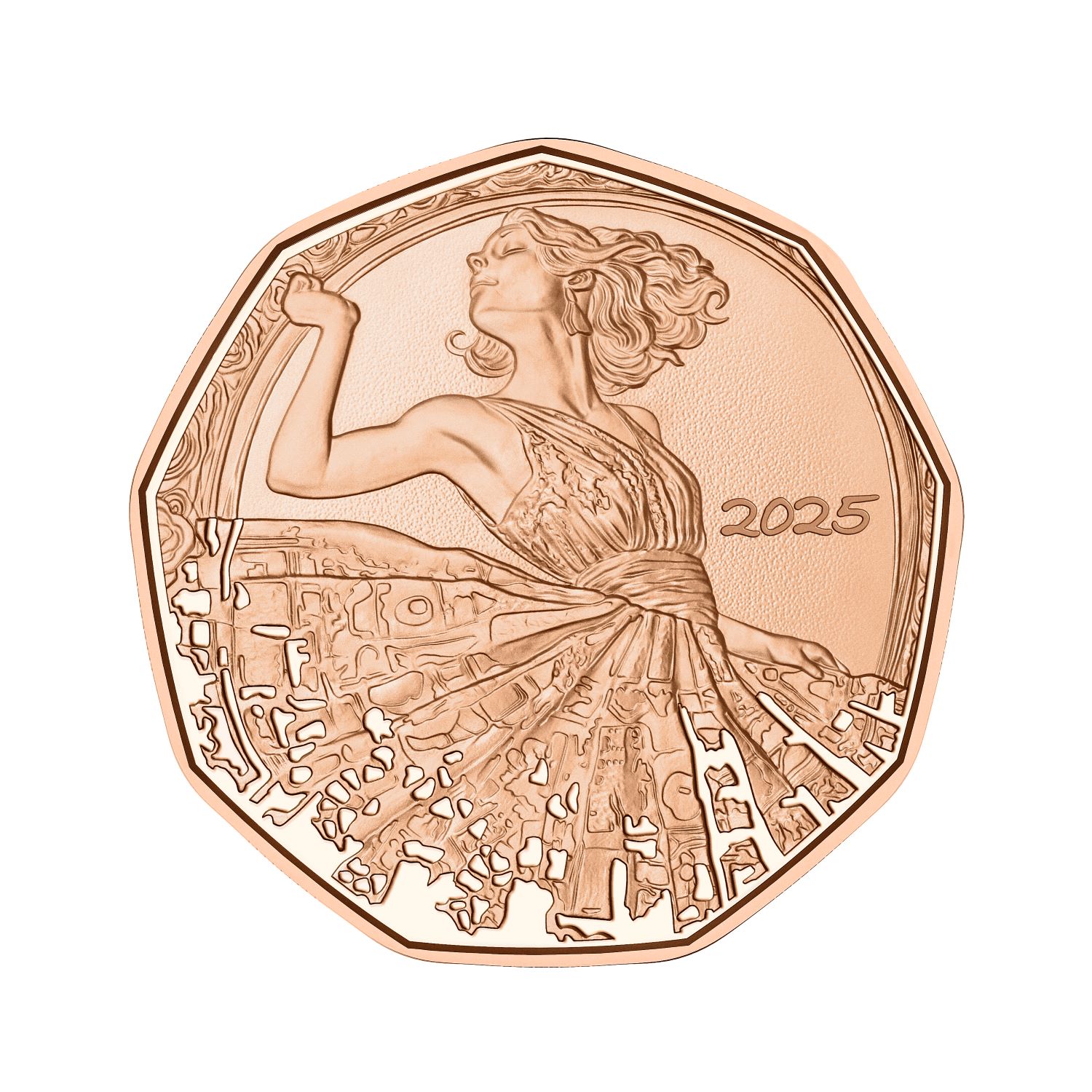 Die Münze zeigt eine Frau, die sich mit geschlossenen Augen dem Tanz überlässt, sich voller Lebensfreude um ihre eigene Achse dreht, sich der Schwungkraft völlig hingibt – alles Energie, alles Lebendigkeit, alles Walzer! Wie bei den vorhergegangenen österreichischen 5-Euro-Münzen sind auf der Wertseite der neuneckigen Münze die neun Landeswappen im Kreis angeordnet.