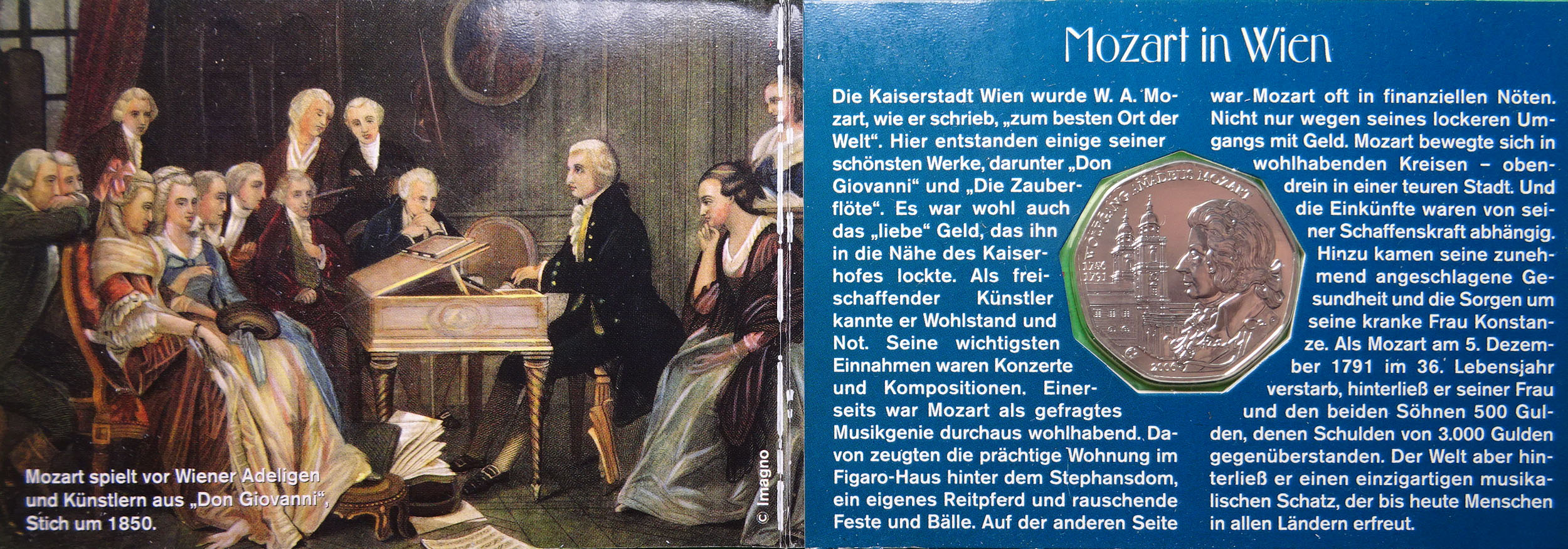 2006 ist Mozarts 250. Geburtstag. Zu diesem Anlass ist die Silbermünze ein eindrucksvolles Sammlerstück. Sie zeigt ein Brustbild Mozarts, im Hintergrund den Salzburger Dom. Ein kleines Zeichen aus Euro-Symbol und Euro-Stern weist die Münze als Teil einer Reihe mehrerer europäischer Länder aus.