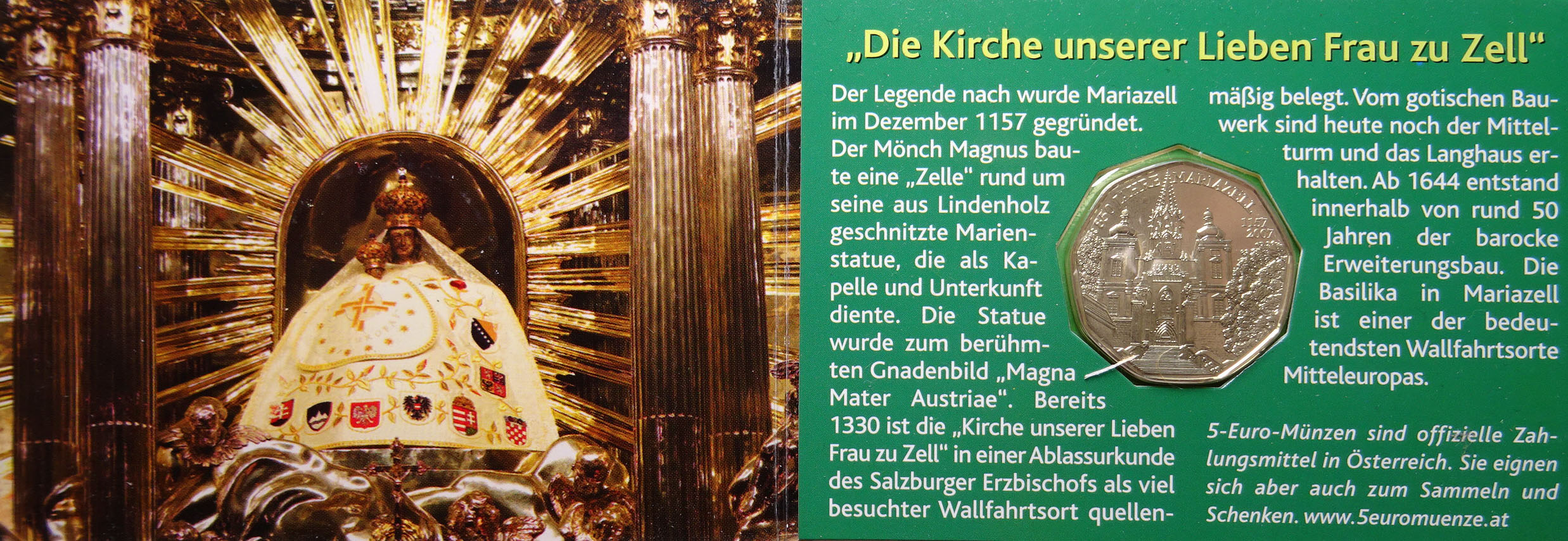 5-Euro-Silbermünze Österreich 2007 „850 Jahre Mariazell“ in grünem Original-Miniblister, Prägequalität Handgehoben (HGH)