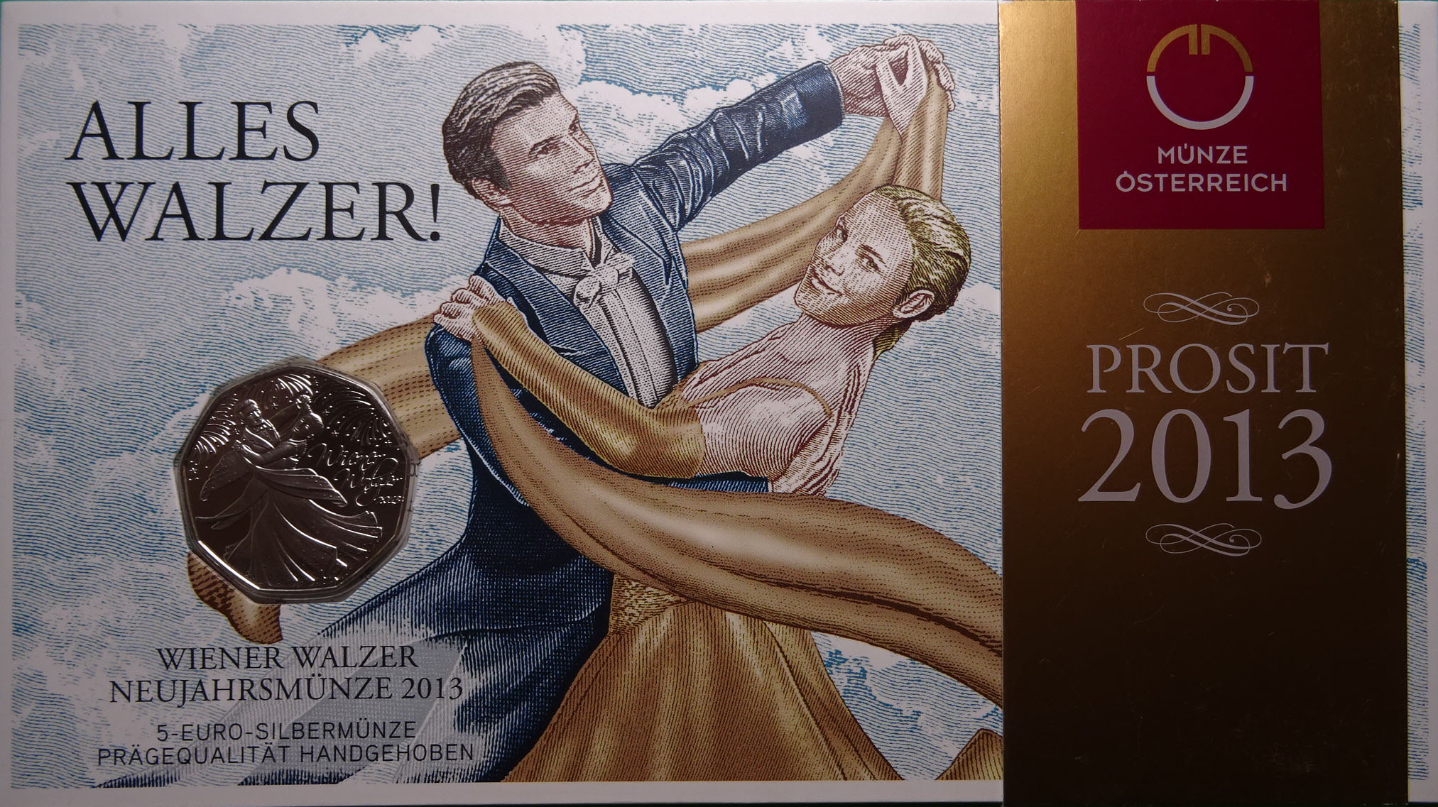 Die 5-Euro-Silbermünze „Wiener Walzer“ wurde 2013 von der Münze Österreich als offizielle Neujahrsmünze ausgegeben. Sie würdigt die weltberühmte Wiener Walzertradition und symbolisiert den festlichen Beginn des neuen Jahres.