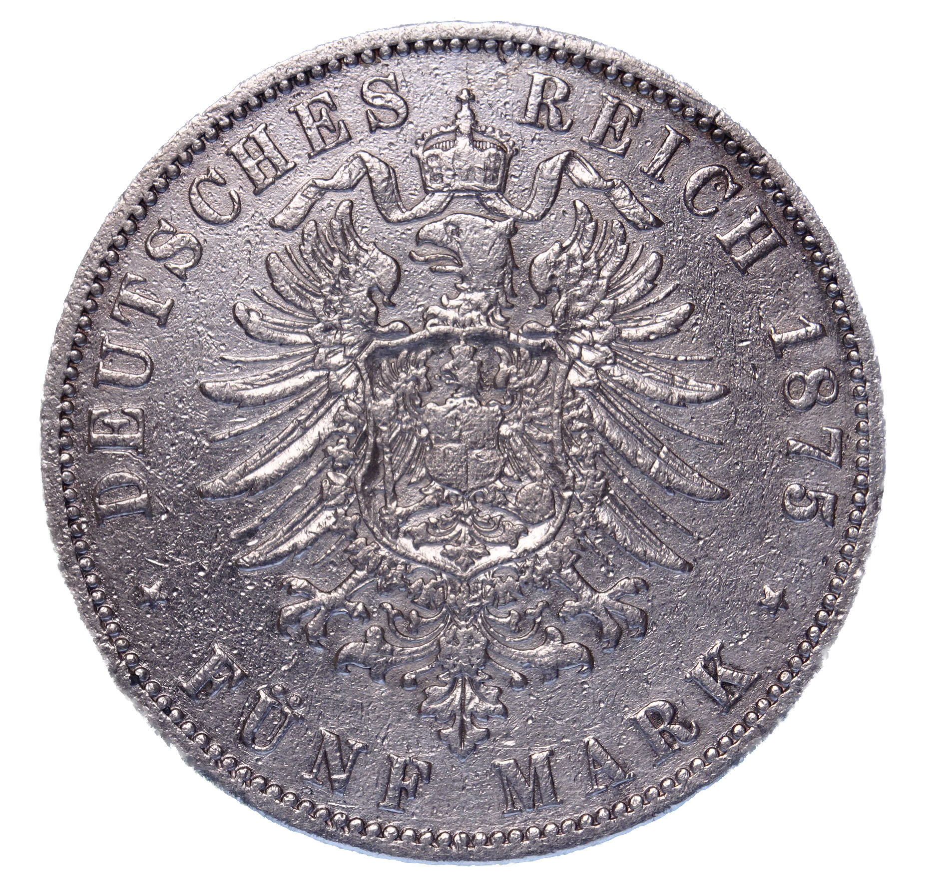 Die 5 Mark Silbermünze von 1875 aus dem Königreich Preußen zeigt Kaiser Wilhelm I. und den gekrönten Reichsadler – ein kraftvolles Symbol der deutschen Reichsgründung. Geprägt in Berlin (A), ist sie ein begehrtes Sammlerstück für Liebhaber des Kaiserreichs.