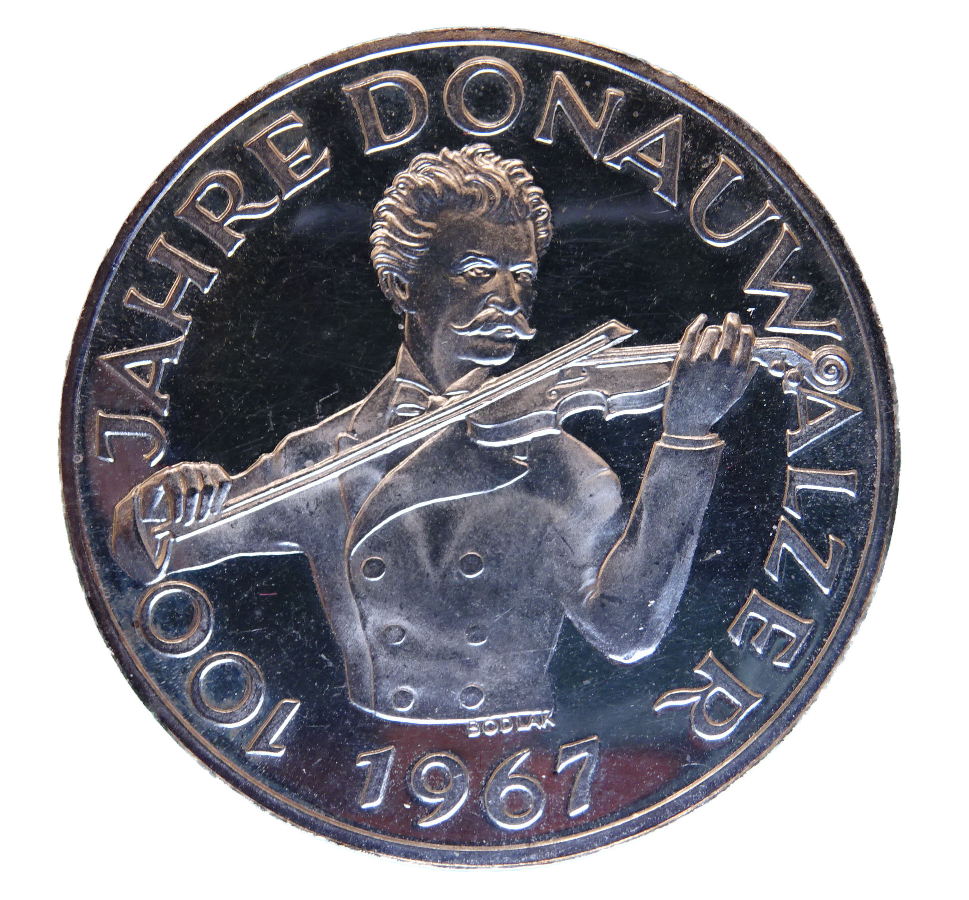 Ein musikalisches Denkmal in Silber: Die 50 Schilling Gedenkmünze von 1967 wurde zum 100-jährigen Jubiläum des weltberühmten Donauwalzers von Johann Strauss Sohn ausgegeben. In Polierter Platte (PP) ist sie besonders begehrt und ein Glanzstück österreichischer Prägekunst.