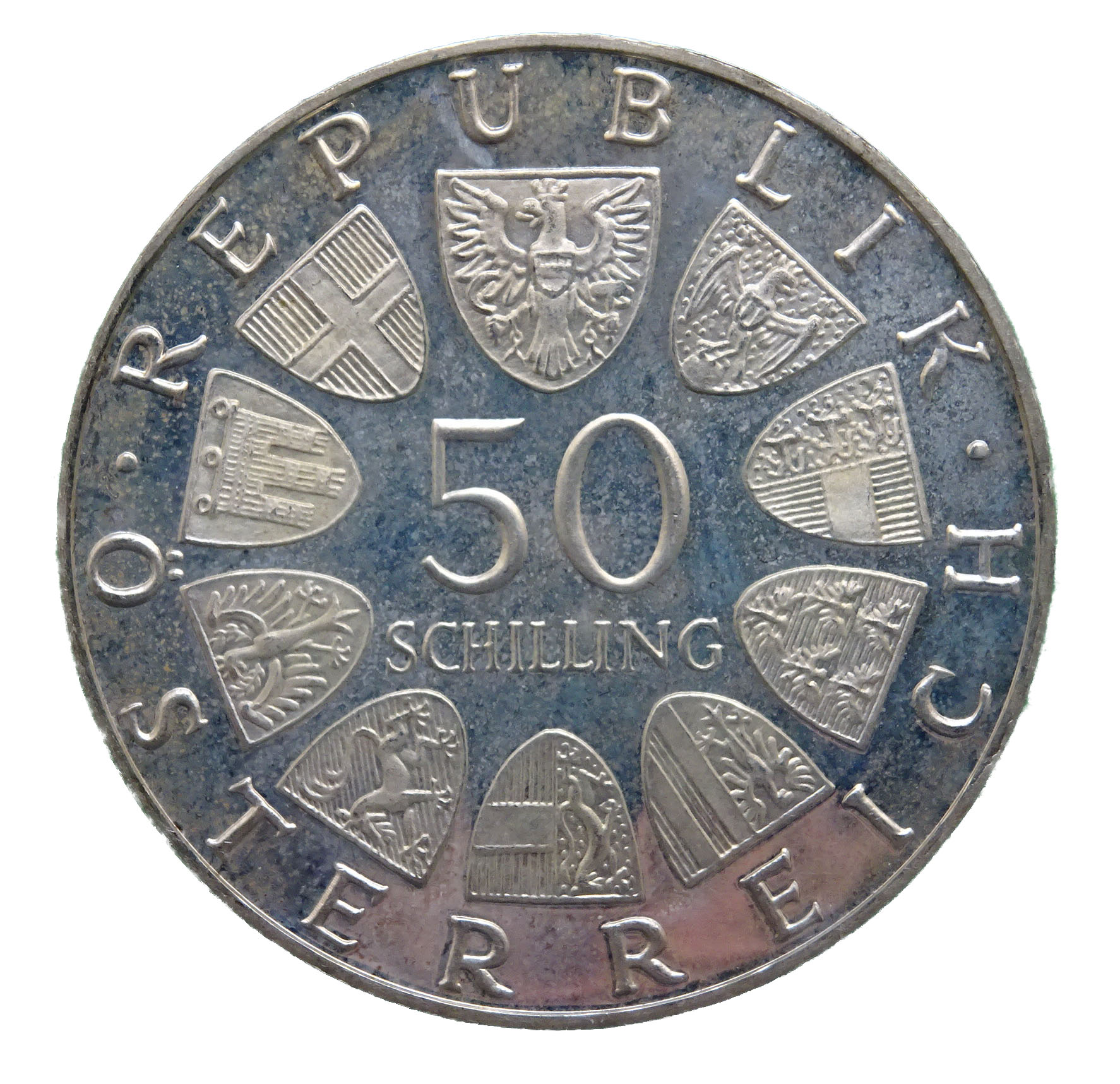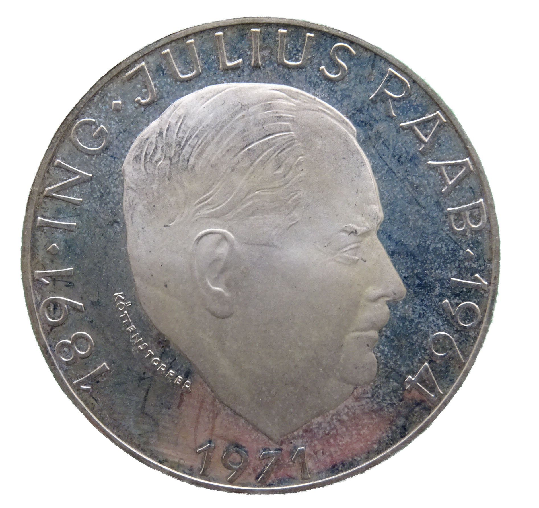 Ein staatsmännisches Denkmal in Silber: Die 50 Schilling Gedenkmünze von 1971 wurde zum 80. Geburtstag von Ing. Julius Raab ausgegeben – Bundeskanzler der Zweiten Republik und Mitgestalter des österreichischen Staatsvertrags.