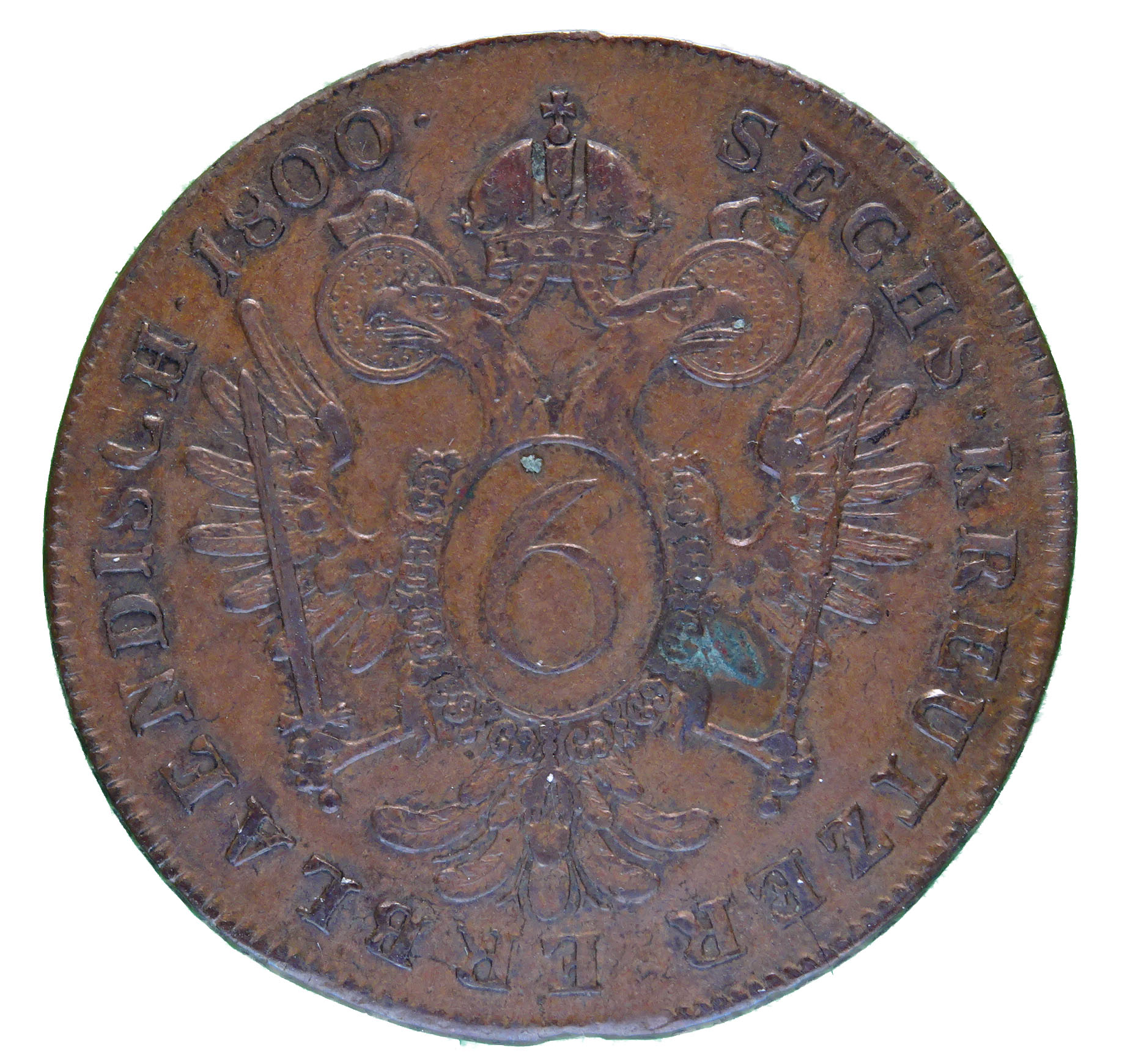 Die 6 Kreuzer Kupfermünze von 1800 wurde unter Kaiser Franz II. geprägt. Sie gehört zur Währungsgeschichte des Habsburgerreiches und ist ein typisches Beispiel für die Kupfer-Nominale dieser Zeit.