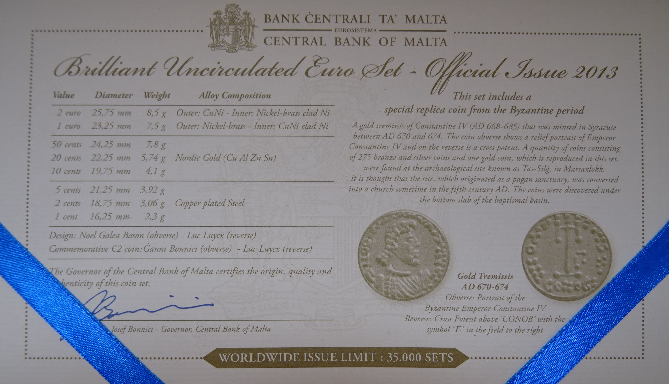 Der offizielle Kursmünzensatz Maltas aus dem Jahr 2013 enthält alle 9 regulären Euro-Münzen sowie die 2-Euro-Gedenkmünze „Autonomie“. Diese Münze erinnert an die Einführung der Selbstverwaltung in Malta im Jahr 1921. Die Münze trägt das Münzmeisterzeichen mit Merkurstab und Schlange.