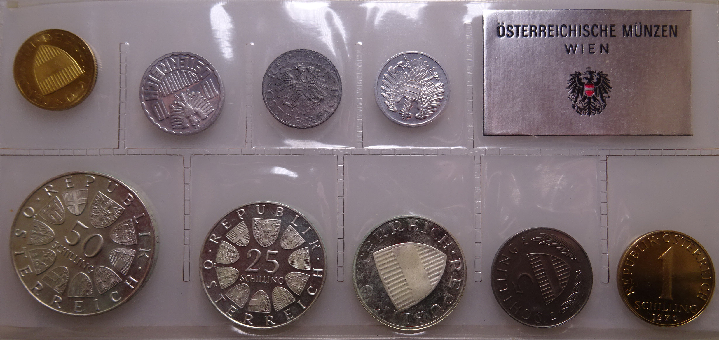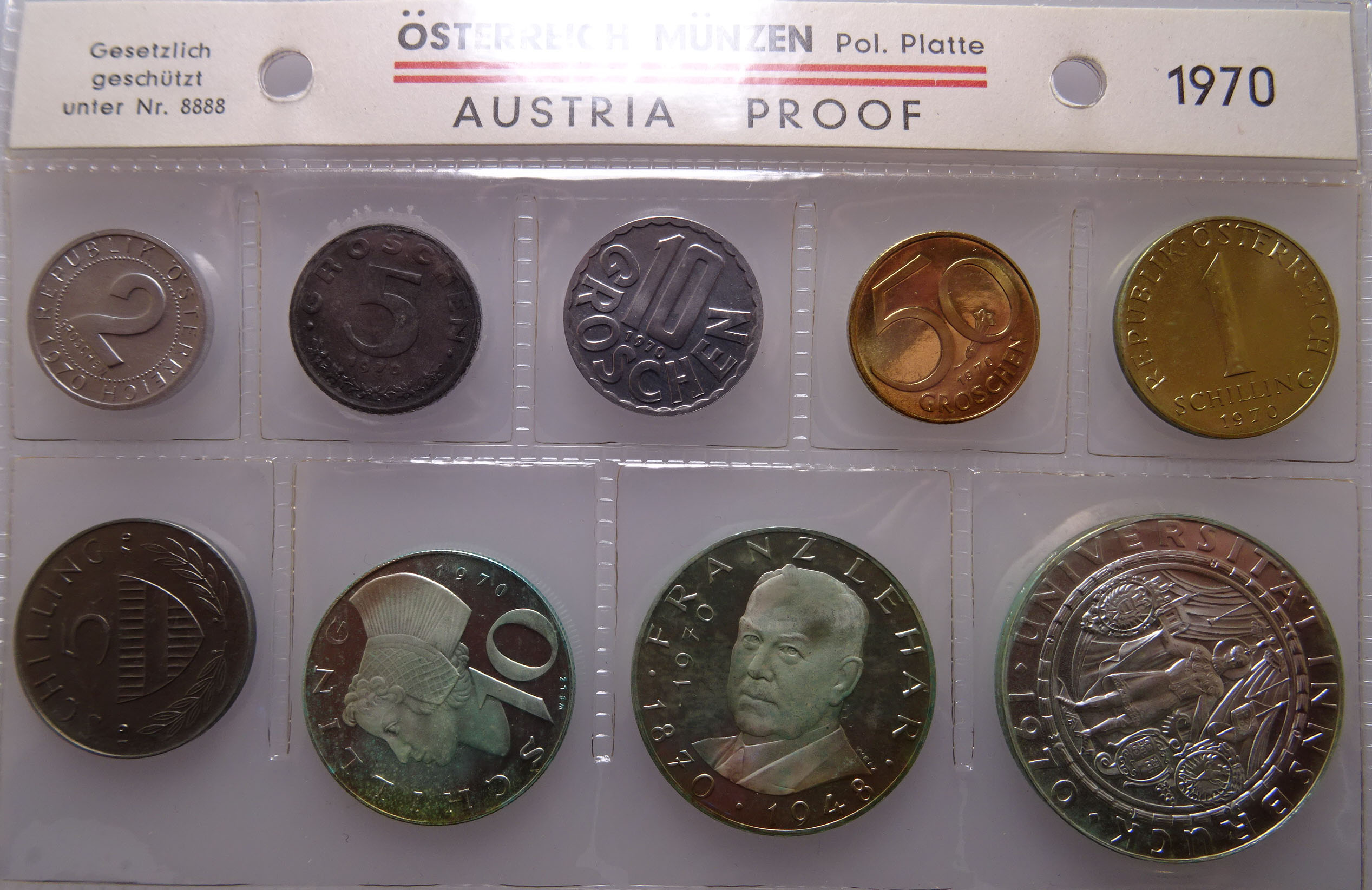 1970 war ein prägendes Jahr der österreichischen Schilling-Ära. Die Kleinmünzsätze in Polierter Platte wurden nur in geringer Auflage hergestellt und sind heute besonders gesucht.