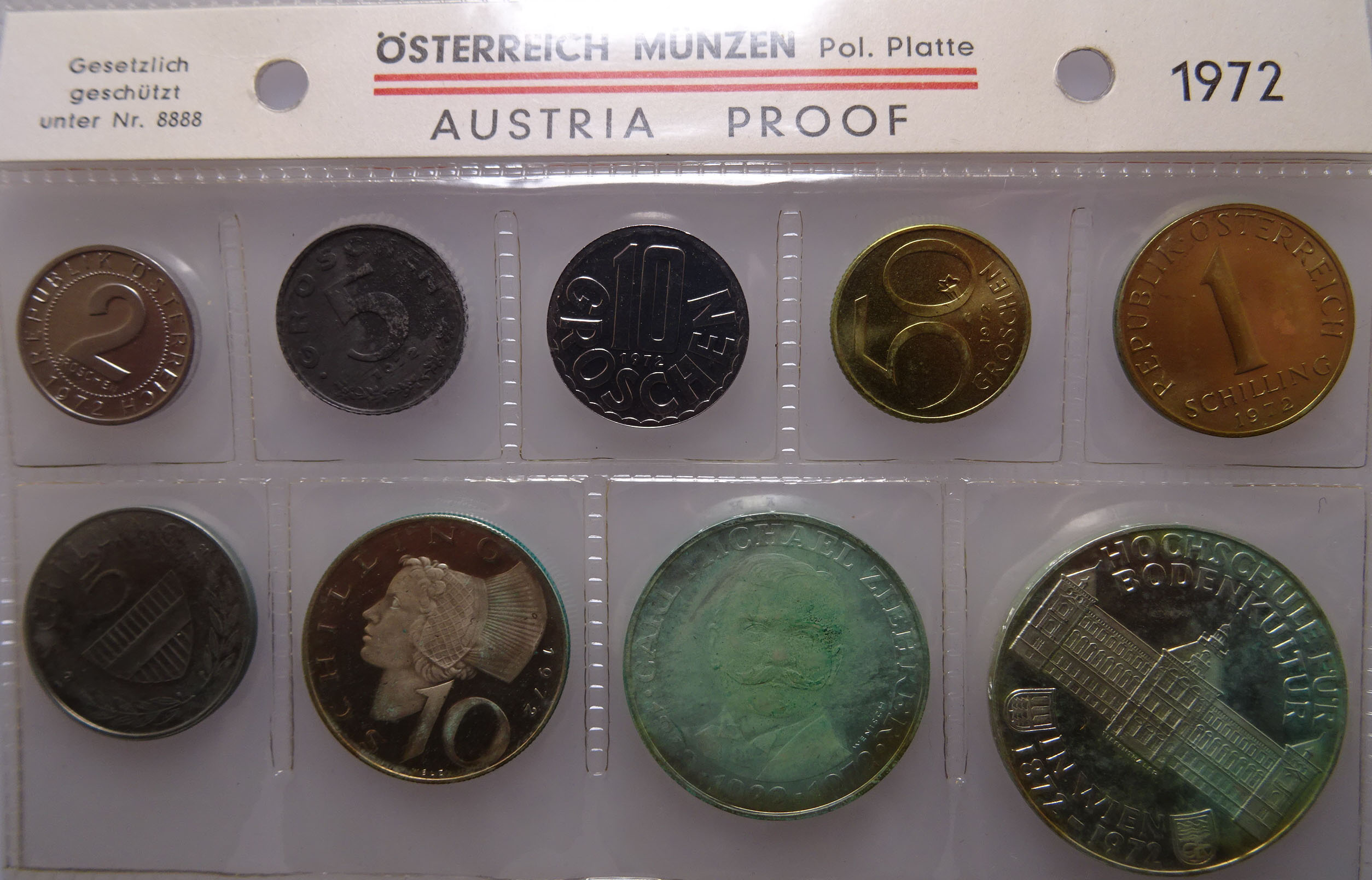 Kleinmünzsatz Österreich 1972 in Polierter Platte (PP) enthält alle Schilling-Kleinmünzen des Jahrgangs in höchster Prägequalität. Die Polierte Platte-Ausführung zeichnet sich durch spiegelnde Felder und besonders scharfe Konturen aus – ein Highlight für anspruchsvolle Sammler.