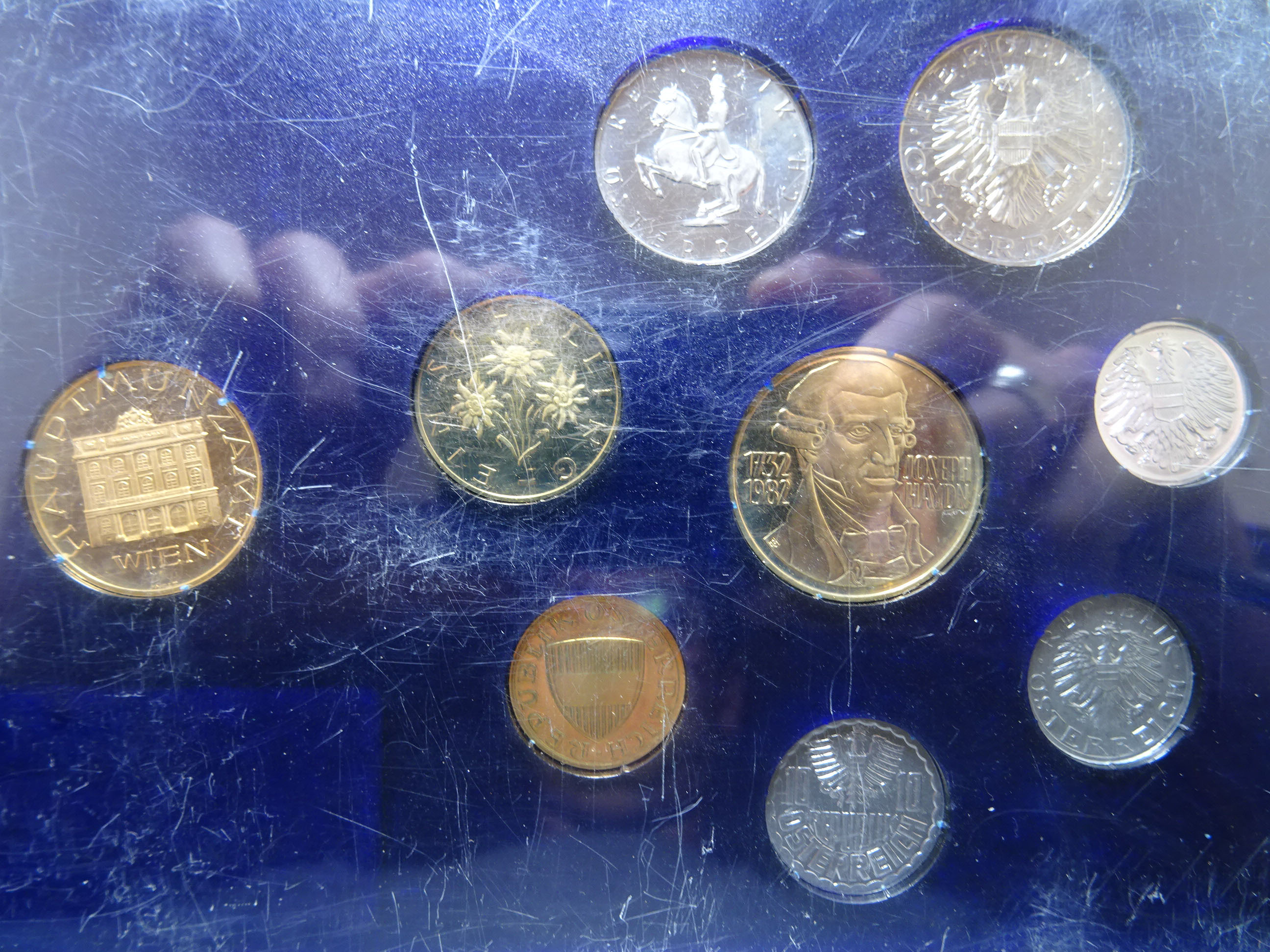 Die spiegelnden Felder und mattierten Reliefs machen diesen Satz zu einem begehrten Sammlerstück für Liebhaber österreichischer Numismatik..