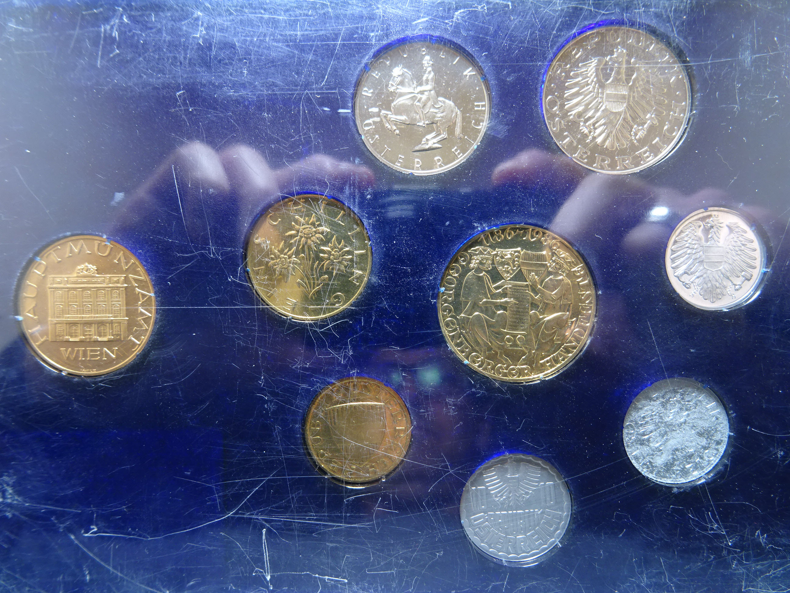 Die spiegelnden Felder und mattierten Reliefs machen diesen Satz zu einem begehrten Sammlerstück für Liebhaber österreichischer Numismatik.