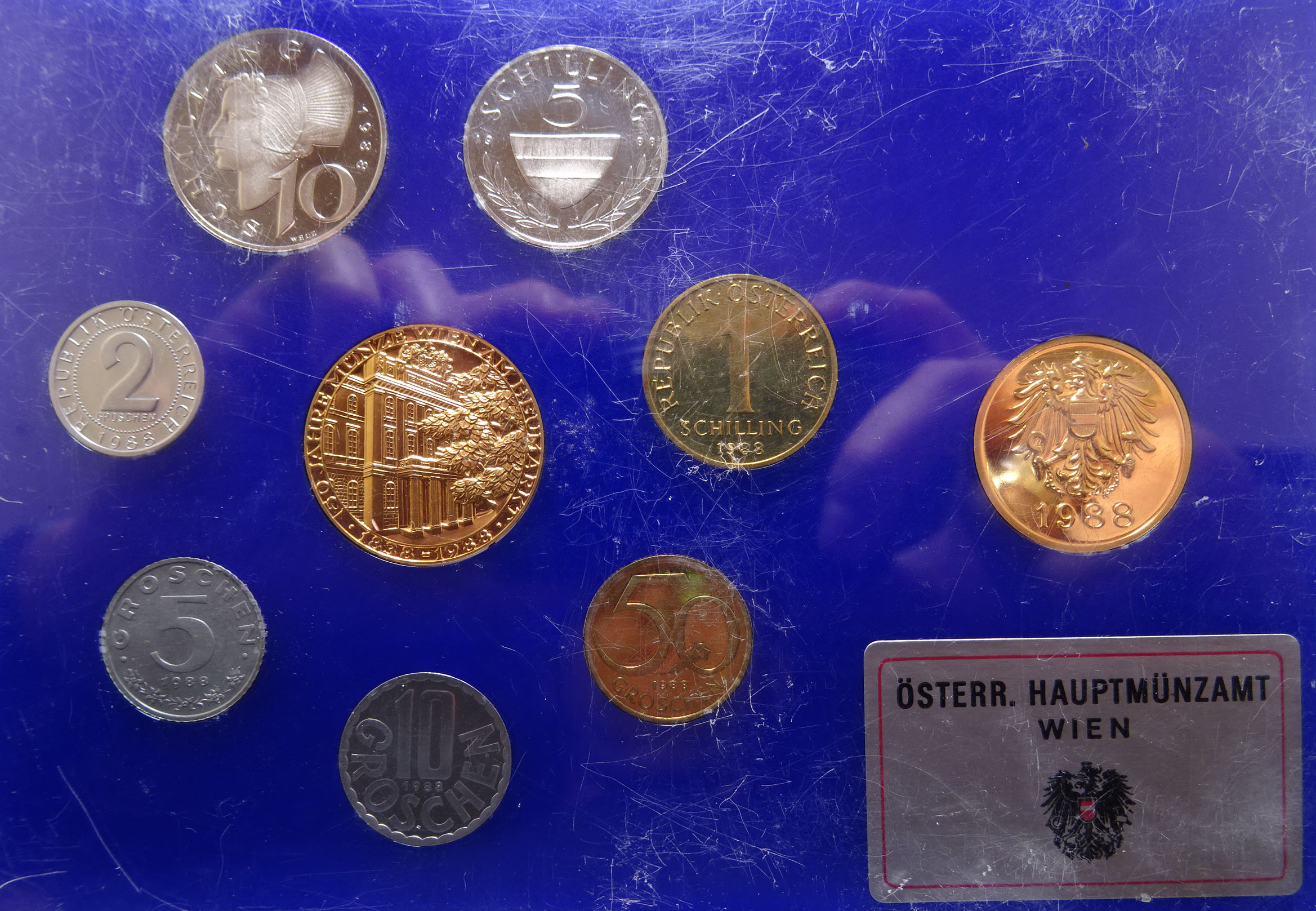 Dieser offizielle Kleinmünzsatz der Republik Österreich aus dem Jahr 1988 enthält alle Schilling-Kleinmünzen des Jahrgangs in der höchsten Prägequalität Polierte Platte (PP).
