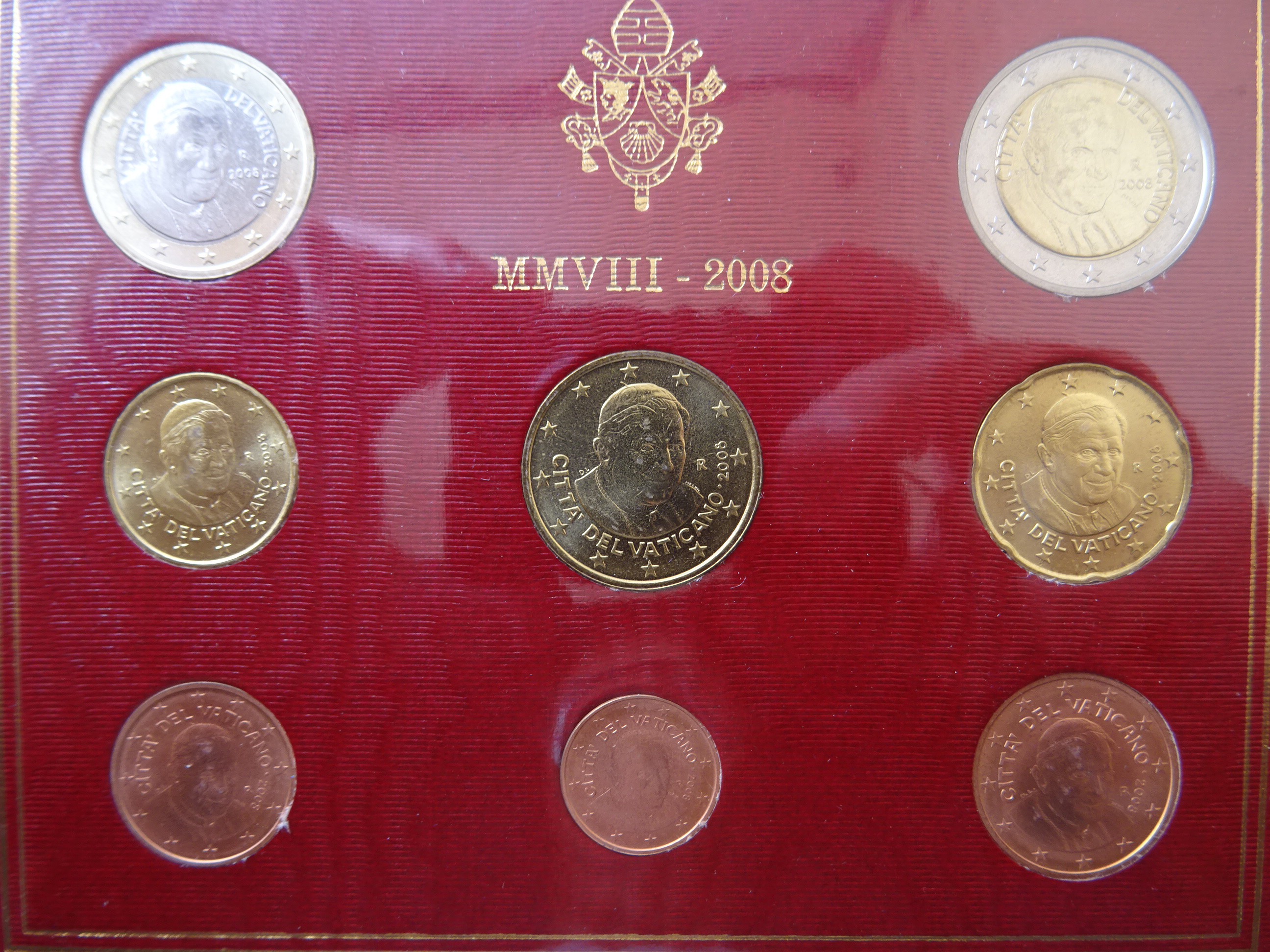 Der Kleinmünzsatz Euro 2008 aus dem Vatikan zeigt Papst Benedikt XVI. in seiner charakteristisch ernsten Pose auf allen acht Münzen. Geprägt in Stempelglanz und geschützt im offiziellen Folder, ist dieser Satz ein würdiger numismatischer Zeitzeuge aus der Mitte seines Pontifikats.
